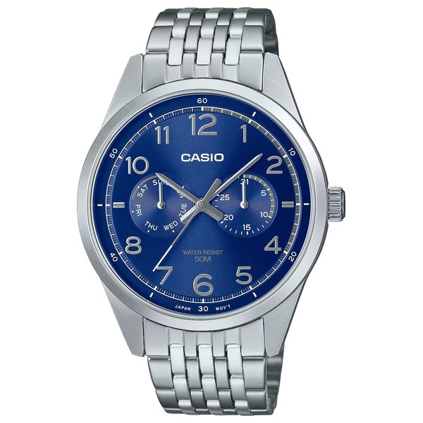 ساعة رجالية أنالوج كلاسيكية بميناء أزرق وسوار فضي من الستانلس ستيل، مقاومة للماء حتى 50 متر، تصميم دائري أنيق مناسب لأي مناسبة.