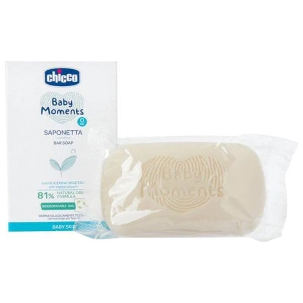 صابون بار شيكو بيبي مومنتس ينظف بلطف ويرطّب بشرة الرضيع الحساسة. يحتوي على 81% من المكونات النباتية ويُضاف إليه غليسيرين نباتي لتهدئة البشرة وتليينها. مُختبر جلدياً وآمن للبشرة الحساسة ومصنوع في إيطاليا، وهو خيار مثالي لحمام الطفل اليومي.