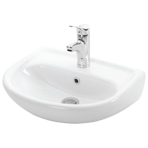 مغسلة بيضاء أنيقة بتصميم حوض منحني ناعم يناسب الحمامات العصرية. أبعادها 50×40 سم، وتناسب المساحات الصغيرة وتحتوي على فتحة التصريف لسهولة الصيانة