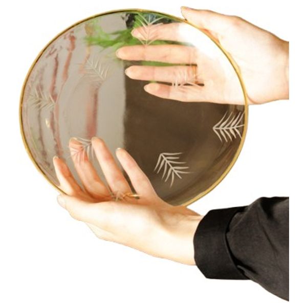 طبق زجاجي شفاف مزين بنقشة أوراق النخيل وحافة ذهبية. يُضفي هذا الطبق لمسة جمالية على تقديم الطعام، إذ يُبرز ألوانه وقوامه. مناسب للمقبلات والحلويات والأطباق الرئيسية