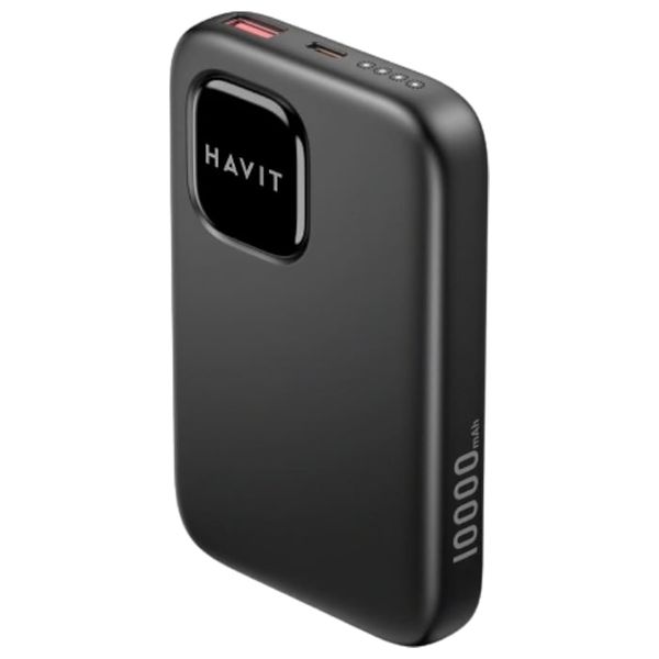 باور بنك مدمج بسعة 10000mAh من هافيت مع شحن سريع 22.5 واط. يحتوي على مخرجات USB-C PD20W وUSB-A 22.5W لشحن الأجهزة بسرعة، ومدخل USB-C لإعادة الشحن السريع. هيكل ABS، الأبعاد 71×110×16 مم، الوزن نحو 197 جم. مناسب