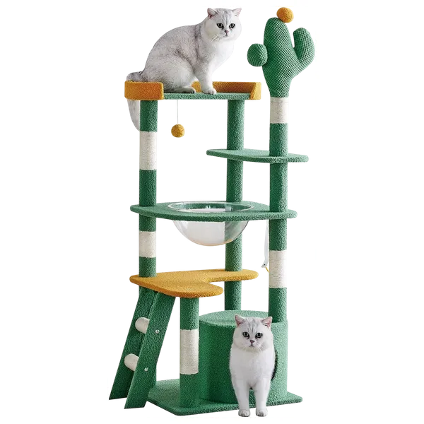 شجرة قطط بتصميم متعدد المستويات مع عمدان مغطاة بالسيسال ولعبة معلقة ومنصة مريحة للاسترخاء