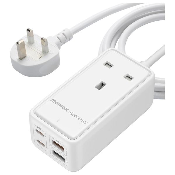 موماكس ONEPLUG 65W GaN Extension Cord with USB أبيض يقدم حلاً مدمجاً وقوياً لتوفير الطاقة وشحن الأجهزة بسرعة. يدعم جهد دخل 100-240 فولت وبحد أقصى 13 أمبير وبقدرة إجمالية 3250 واط. إخراج USB-C يوفر PD حتى 65W (5V/3A، 9V/3A، 12V/3A، 15V/3A، 20V/3.25A)، بينما إخراج USB-A يوفر QC حتى 18W. الإخراج المتعدد PD27W + PD20W + 5V3A، المادة 94VO مقاومة للهب، الأبعاد 105x53x39 مم، الكابل بطول 2 م، الوزن 376 جم. مناسب للاستخدام المنزلي والمكتب.