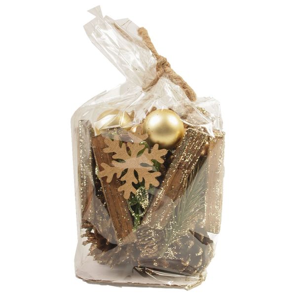 كيس صنوبر ذهبي يحتوي على مزيج منتقّى من الصنوبر الطبيعي والأعشاب والنباتات وقطع خشبية، ونجمة ثلجية وكُرات لامعة