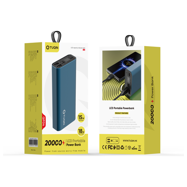 شاحن متنقل من كيو-توكين بسعة 20000mAh يوفر هيكلًا متينًا من ABS مع سبائك الألومنيوم وبطارية بوليمر عالية السعة ليبقى جهازك مشحوناً أثناء التنقل. يدعم منافذ إدخال Micro وType-C وLightning ومخارج USB وType-C لشحن متنوع للهواتف والأجهزة اللوحية وغيرها. حجمه المدمج ووزنه 432 جم يجعل حمله مريحاً للمستخدمين في العراق.