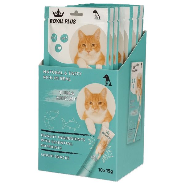 وجبات خفيفة فاخرة للقطط، تأتي في عبوة أنبوبية سهلة الضغط، مصنوعة من التونة والروبيان الحقيقيين لتقديم وجبة لذيذة ومرطبة، وهي مناسبة للإطعام اليدوي أو كإضافة للوجبات الجافة. تشمل فوائدها الرئيسية الفيتامينات الأساسية D3 وB6 وE لدعم صحة العظام، واستقلاب الطاقة، والمناعة، وصحة الخلايا