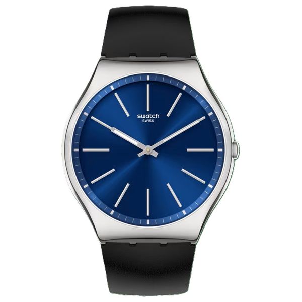 ساعة النحيفة جدًا من الفولاذ المقاوم للصدأ تتميز بعلبة مصقولة وقرص أزرق مشع مع لمسات فضية من سواتش. الحزام جلدي أسود يُغلق بإبزيم من الفولاذ المقاوم للصدأ. الحركة كوارتز ومقاومة الماء حتى 3 بار. قطرها 42.00 مم، سماكتها 6.70 مم، والمسافة بين الأطراف 45.60 مم