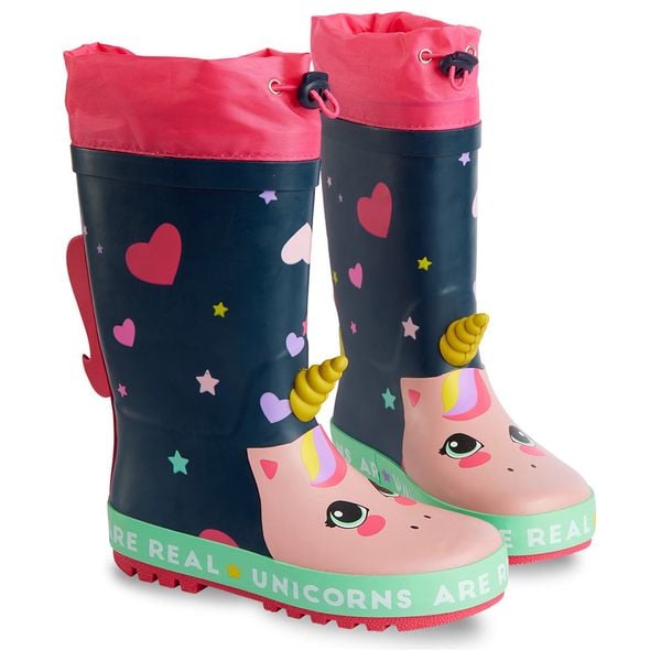 حذاء مطر مقاوم للماء بطبعة وحيد القرن. قرن وذيل وحيد القرن ثلاثي الأبعاد. يوجد حبل تعديل على الكاحل لمنع تسرب الماء. الخامة: الجزء العلوي، النعل: 100% مطاط، البطانة: 75% بوليستر، 25% قطن. يُغسل في الغسالة. يُنظف بالمسح. بما أن الكاحل مفتوح، يُمكنك تعديل الحبل ومنع تسرب الماء.