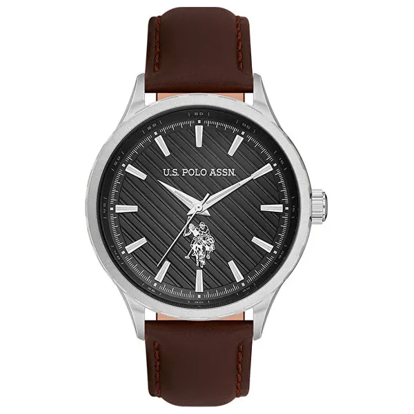 ساعة رجالية بتصميم كلاسيكي، مع علبة دائرية من الفولاذ باللون الرمادي المعدني بحجم 42 ملم وسمك 11 ملم، وقرص أسود تناظري، تعمل الساعة بحركة كوارتز، ومقاومة الماء حتى 5 ATM، السوار جلدي بني من جلد العجل بعرض 20×18 ملم وطول 20 سم، الوزن 53 غم