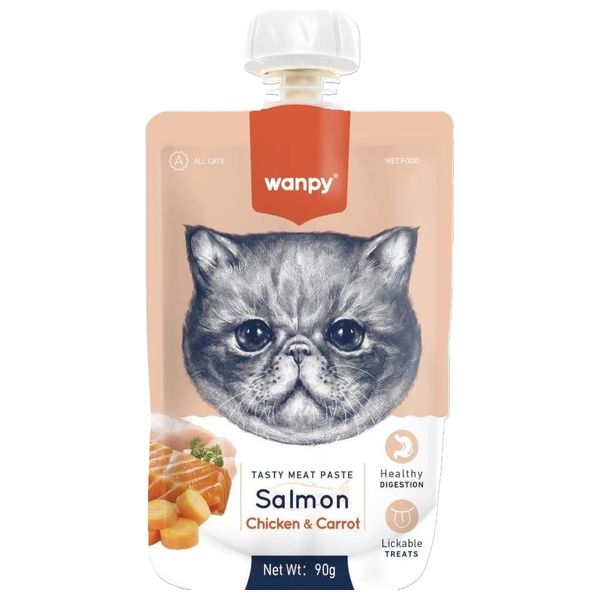 مزيج لذيذ من سلمون و دجاج وجزر في قوام طري يمكن ضغطه كمكافأة تدريب، أو كدهن على حصيرة اللعق، أو كمضاف لطعام القط، كما يسهل استخدامه عند إعطاء الدواء. المكونات تشمل السلمون والدجاج والجزر وبونيتو ونشا وصمغ زانثان وتورين وفيتامينات A وB2 وB3 وB5 وD3 وE وألوان. الوزن الصافي: 90 جم.
