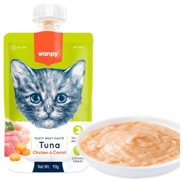 وجبة طرية ومتعددة الاستخدامات للقطط. استخدمه كمكافأة تدريب أو كإضافة لطعام القطط، كما يمكن دهنه على حصيرة اللعق وتسهيل تناول الدواء عبر إخفائه. كما يمكن استخدامه كحشوة في ألعاب الوجبات الخفيفة. تركيبة تحتوي على التونة والدجاج والجزر مع التورين وفيتامينات أساسية. البروتين 3%، الدهون 0.1%، الألياف 1%، الرماد 1.5%، الماء 91%
