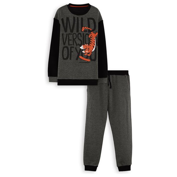 طقم رياضي من قطعتين للأولاد. أكمام طويلة، ياقة دائرية، مصنوع من قماش سميك. يتميز الجزء العلوي بقصة واسعة وطبعة حيوانية لطيفة. يحتوي البنطال على جيبين. خصر مطاطي بأحزمة. جميع منتجات دينوكيدز مصنعة وفقًا لإرشادات سلامة الأطفال، وقد تم فحصها بواسطة أجهزة الكشف عن المعادن. الخامة: الجزء العلوي: القماش 1: 65% بوليستر، 24% قطن، 8% فيسكوز، 3% بولي أميد. القماش 2: 60% قطن، 36% بوليستر، 4% فيسكوز. الجزء السفلي: 65% بوليستر، 24% قطن، 8% فيسكوز، 3% بولي أميد. تعليمات الغسيل: يُغسل مقلوبًا مع ألوان مشابهة. لا يُستخدم المبيض. لا يُغسل بالتنظيف الجاف. لا يُجفف في المجفف الآلي.