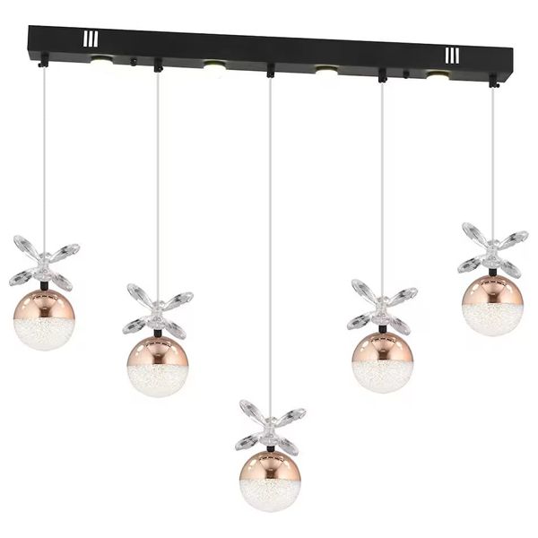 This 75x75cm LED pendant light features five lights and a modern design combining crystal-decorated cables and rose gold cups with white accents. The adjustable cable length accommodates different ceiling heights, making it a balanced focal point for hallways, living rooms, lounges, and restaurants, all illuminated by LEDs.