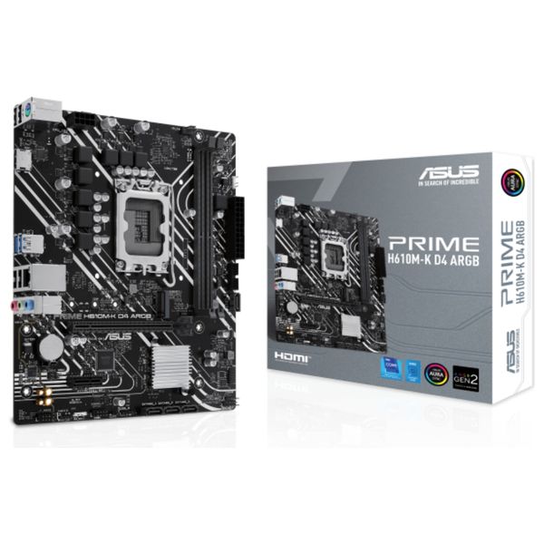 The ASUS Prime H610M-K D4 ARGB micro-ATX motherboard supports 12th, 13th, and 14th Gen Intel processors via the LGA 1700 socket. It features DDR4 memory, PCIe 4.0, and a fast M.2 slot, along with Realtek 1Gb Ethernet and USB 5Gbps. Equipped with Aura Sync RGB for customizable lighting and two-way AI noise cancellation for clear audio during gaming or video calls.