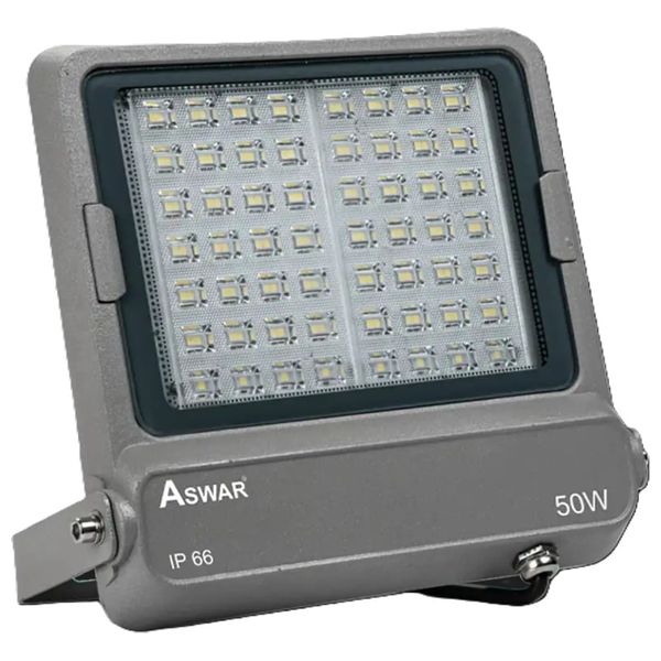 Aswar AS-LED-FG50-CW LED Floodlight delivers reliable outdoor illumination with 50 watts of power. It features a high power factor of 0.95, 6500K cool white light, and IP66 protection for rain and dust resistance. The light operates from 95 to 265 V AC, suitable for exterior applications such as building facades, parking lots, and construction sites. The gray housing provides durable outdoor performance.