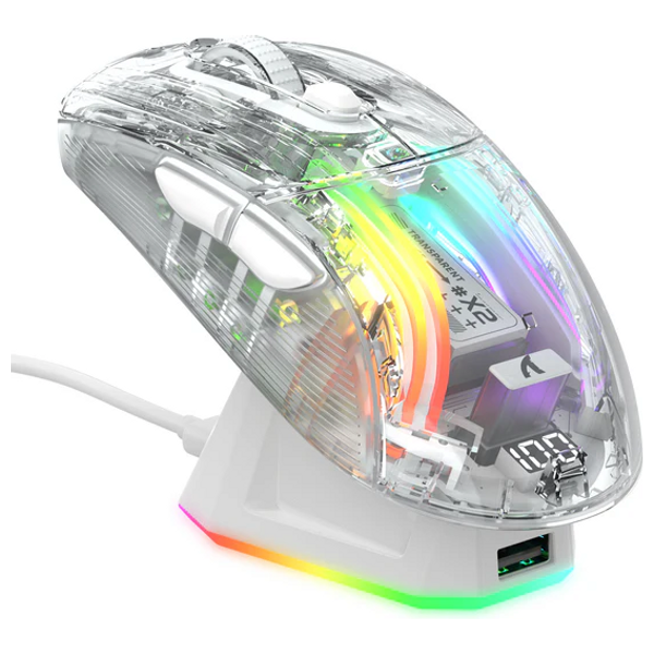 The ATTACK SHARK X2 Pro gaming mouse offers triple-mode connectivity and a transparent RGB design with silent buttons, a magnetic charging dock, and a precision PixArt sensor with up to 4000 DPI. Ideal for gaming and productivity with fast charging and battery display.