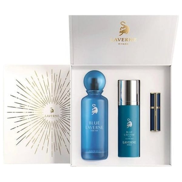 Blue Laverne 7:00 AM, by Laverne, offers a fresh unisex fragrance experience. The gift set blends marine notes with lavender and white musk, finished with warm woody undertones for everyday sophistication. The package includes a blue bottle, a matching spray, and an accessory in an elegant white box, ideal for gifting or personal use.
