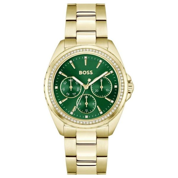 The Boss 1502714 blends elegance with practicality. It features a 38 mm round case, a green dial with three subdials for 24-hour time, date, and day, and a zircon-adorned bezel. The gold-tone stainless steel bracelet is secured with a fold-over clasp, and the dial is protected by mineral glass. With quartz movement and a 3 ATM water resistance, this timepiece suits daily wear while making a refined statement. (In Iraq)
