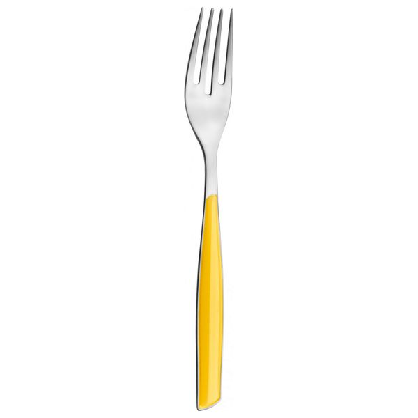 Casa Bugatti Glamour Dessert Fork GL6U-02105 features a polished stainless steel head paired with a bright yellow resin handle. This dessert fork combines durability and a cheerful accent to elevate casual meals and special occasions. The ergonomic handle provides comfortable grip while the sleek line complements modern table settings. Perfect for desserts, pastries, and fruit courses.