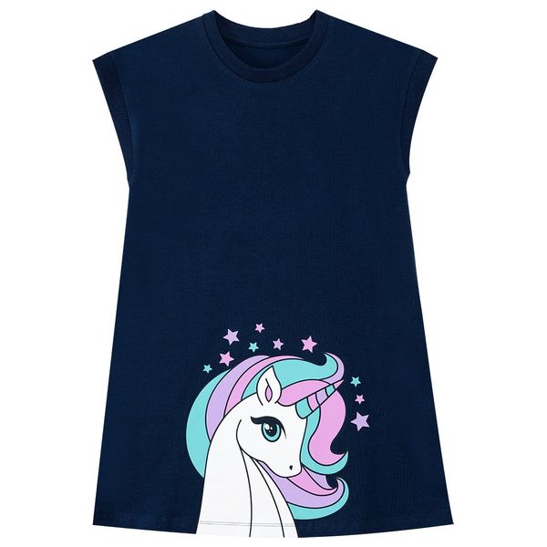Cotton jersey, girl navy blue dress. A cute unicorn print on. All Denokids products are produced within Kids Safety Guidelines. To avoid any needles or metal debris, all products are inspected by metal detectors., Material 95% Cotton 5% Elastane, Washing ins. Machine wash at 30°C. Wash inside out. Do not bleach. Do not tumble dry. Iron backside on low heat.