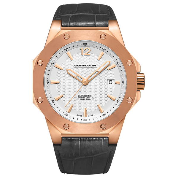 Hand Watch Swiss Made: Size: 41 mm Case: Octagonal stainless steel case with rose gold PVD-coating Glass: Sapphire crystal Movement: Swiss made Quartz Functions: Date, Big Second Water resistance: 50 meters Bezel: 8 screw bezel Dial: White dial with Super LumiNova on hour and minute hands Bracelet: Grey calf leather strap with croco structure Case back: Screwed case back Buckle: Signed butterfly buckle with side pushers Limited edition: 999 Warranty: 1 years Ref: CO 2021-2019
