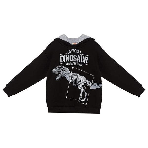 Long sleeve, black hoodie. Thick, soft and warm. Fetaures a dinosaur print on chest. Has lining inside the hood. All MSHB&G products are produced within Kids Safety Guidelines. To avoid any needles or metal debris, all products are inspected by metal detectors., Material F1: 53% Cotton 40% Polyester 4% Acrylic 3% Viscose , Washing ins. Machine wash at 30°C. Wash inside out. Do not bleach. Do not tumble dry. Iron backside on low heat.