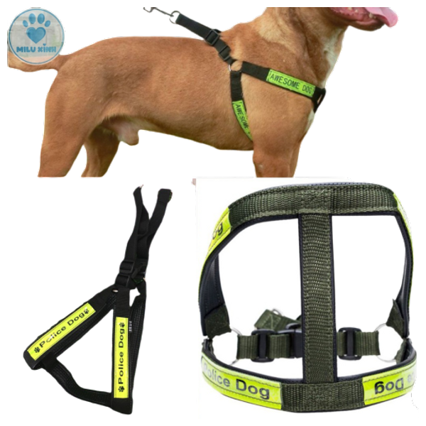 Designed for large dogs, it features a durable, adjustable harness with secure closures and reflective straps for enhanced visibility. The harness's design provides a balanced distribution of pressure across your dog's chest and shoulders to ensure comfort during walks and training.