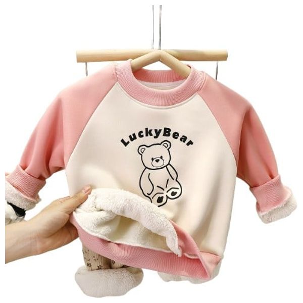 This pink girls' sweatshirt features a cute bear print. It has a soft faux fur lining for extra warmth, and an easy pull-on buttonless design with a crew neck and elasticated cuffs.
