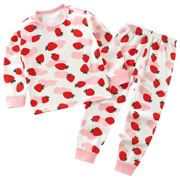 Girls' strawberry print pajama set, made from a soft cotton blend, with a white base decorated with red strawberries and pink clouds.