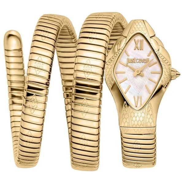 This elegant Just Cavalli women's watch in gold features an analog quartz movement, an asymmetrical embossed white dial, and a 22mm case. Its stainless steel snake-patterned strap with a butterfly clasp provides a stylish and secure fit. Water resistant to 30 meters.