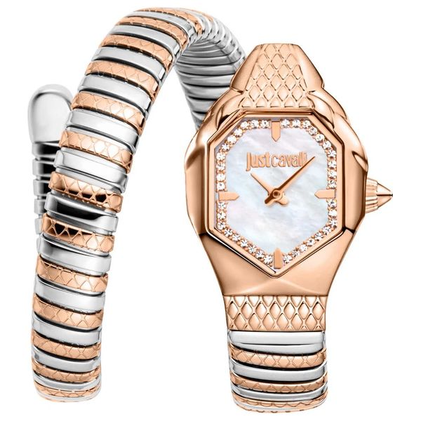 The Just Cavalli women's elegant watch from the Snake collection features a two-tone stainless steel bracelet, a 22mm stainless steel case, and a white mother-of-pearl dial with crystal accents. It is powered by a quartz movement, has a mineral crystal, and is water-resistant to 30 meters.