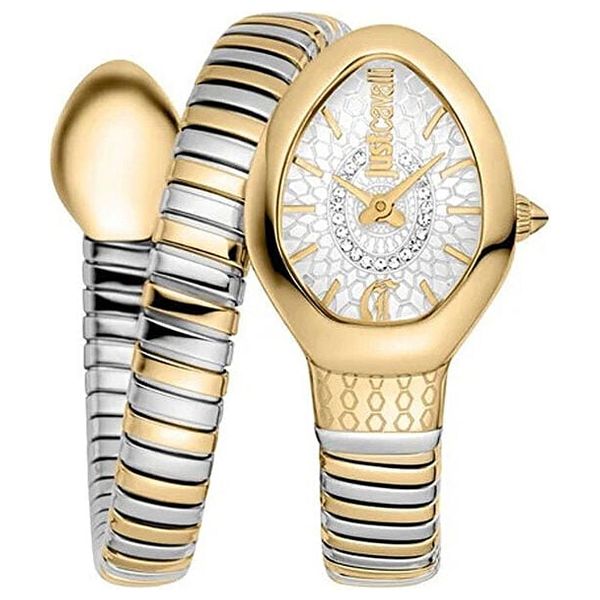 A two-tone gold and silver women's wristwatch. It features a 22mm oval steel case, a silver dial with gold-tone hands, a steel bracelet with alternating gold and silver links, and a mineral crystal. This analog watch is powered by a quartz movement, offers water resistance up to 3 ATM, has a 10mm wide band, and weighs 45 grams.
