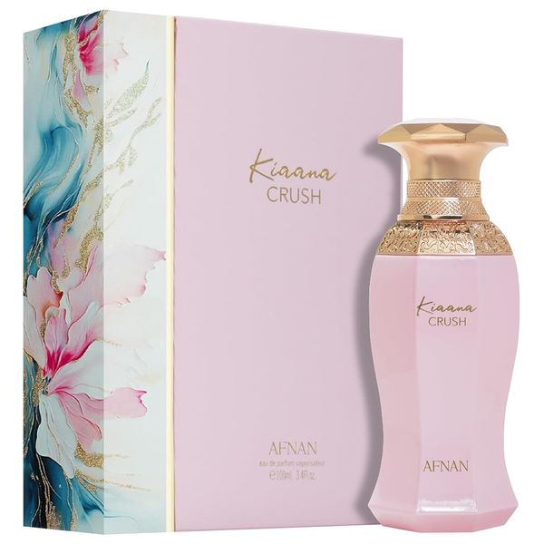 Kiiana Crush by Afnan is a feminine Eau de Parfum that blends a warm floral-amber character. The middle notes mix saffron, passion fruit, patchouli, and oud wood, while the base notes reveal Madagascar vanilla, ambroxan, musk, cedarwood, and incense. Encased in a pink bottle with a gilded cap, this 100 ml