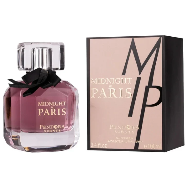 Midnight in Paris by Pendora Scents is a feminine Eau de Parfum that opens with bright fruity top notes of pear and red berries, creating a sparkling and refreshing introduction. The heart reveals white florals, including jasmine and orange blossom, adding an elegant and feminine touch. The base features warm vanilla, amber, patchouli, and white musk, leaving a long-lasting, warm, and sensual trail. This fragrance suits daily wear and special occasions, offering an elegant presence in Iraqi life and events.