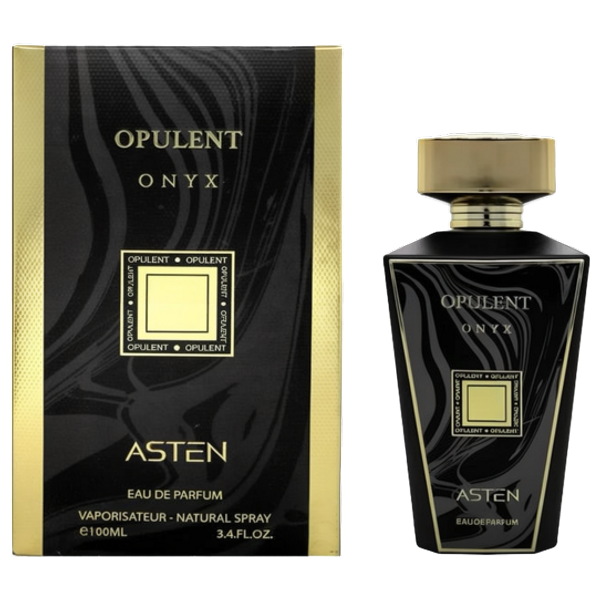Opulent Onyx by Asten is a men's Eau de Parfum opening with leather, revealing a spicy amber heart, and settling into a warm base of labdanum, musk, and cedarwood for a long-lasting, sophisticated scent. 100 ml bottle.