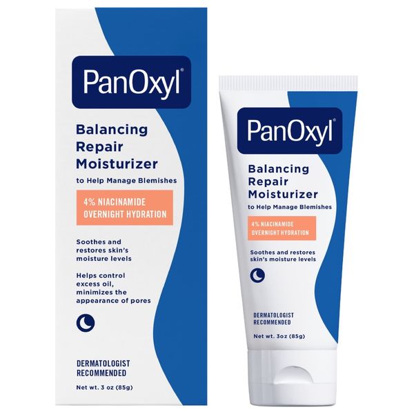 PanOxyl Balancing Repair Moisturizer Niacinamide is a dermatologist-recommended moisturizer that supports the skin's moisture balance while helping manage blemishes. Formulated with 4% niacinamide, it provides overnight hydration to soothe and restore the skin. The moisturizer helps control excess oil and reduces the appearance of pores, supporting a healthier, more balanced complexion for blemish-prone or oily skin. Use as part of a nightly skincare routine after cleansing.