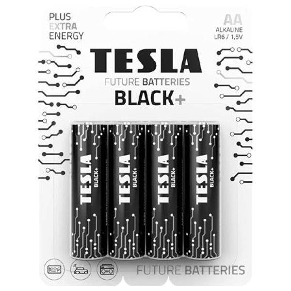 Tesla BLACK+ alkaline batteries AA LR6 deliver reliable power for everyday devices. This 4-pack provides 1.5V per battery and is suitable for remotes, toys, flashlights, and other household gadgets, offering long shelf life and steady performance.