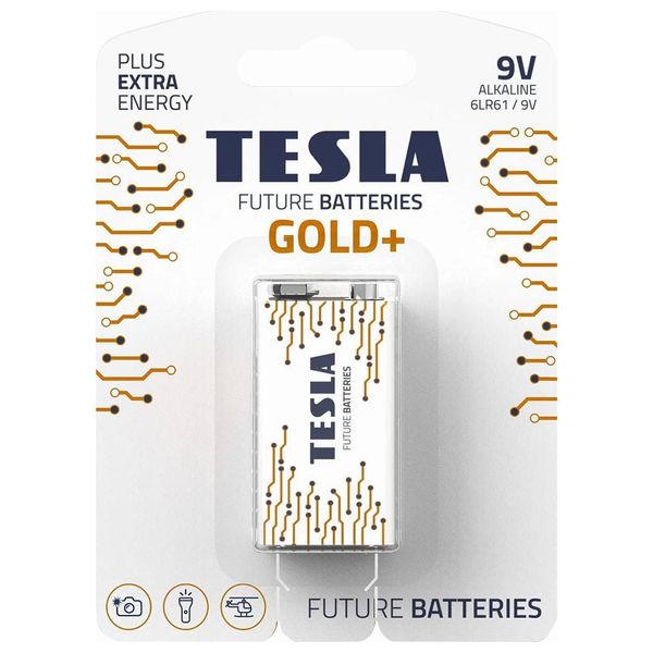 Tesla GOLD+ 9V alkaline battery (6LR61) delivers reliable, long-lasting power for everyday devices. Ideal for remotes, alarm clocks, toys, and other 9V-powered gadgets. Single-pack alkaline cell designed for consistent performance and low leakage.