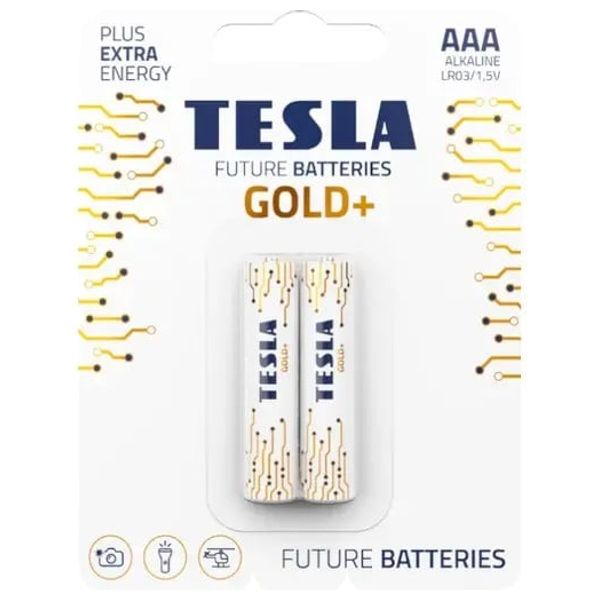 Tesla GOLD+ AAA alkaline batteries (LR03), 1.5V, 2-pack. Reliable power for everyday devices, with a long shelf life up to 10 years from manufacture and strong corrosion resistance; mercury- and cadmium-free for safe use.