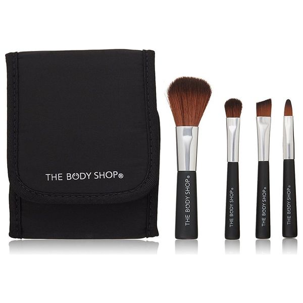 The Body Shop Mini Brush Set 5 PCS includes four miniature makeup brushes for cheeks, eyes and lips housed in a mirrored case, featuring ultra-soft bristles for smooth, precise makeup application. Includes a small makeup bag for on-the-go touch-ups.