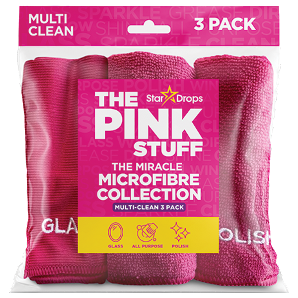 The Pink Stuff Microfibre Collection includes three pink microfiber cloths designed for glass cleaning, all-purpose cleaning, and polishing. Soft and highly absorbent, these cloths lift dirt without scratching surfaces, making them suitable for household use