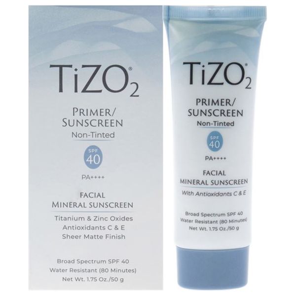 Colorless sunscreen cream with SPF 40. TIZO2 Primer Sunscreen Non-Tinted is a mineral formula that provides broad spectrum protection with titanium dioxide and zinc oxide. It contains antioxidants C and E, offers a sheer matte finish, and is water resistant for up to 80 minutes. This facial sunscreen can be worn under makeup and is suitable for all skin types.