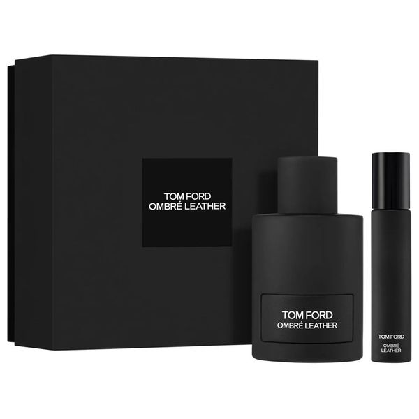 Unisex gift set featuring Tom Ford Ombre Leather in a 100 ml bottle plus a 10 ml travel spray. The fragrance opens with cardamom, reveals leather and jasmine sambac at the heart, and rests on an amber, moss, and patchouli base. This sophisticated duo delivers bold leather notes with refined sillage, making it suitable for daily wear or special occasions.
