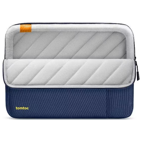 Tomtoc 13-inch laptop bag offers full protection with CornerArmor and soft padding, made from recycled spill-resistant fabric, featuring durable lining and an extra pocket for electronic accessories.