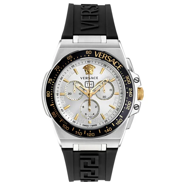 Men's watch with a 45mm stainless steel case and a black silicone strap featuring a 3D Greca motif. The silver dial features a sunray effect with a Greca motif on the inner ring, with the date at 6 o'clock and the day and date at 12 o'clock, and raised numerals and logo on the upper bezel. The watch is powered by a precise Swiss quartz chronograph movement. It is water resistant to 5 ATM and has a folding buckle.